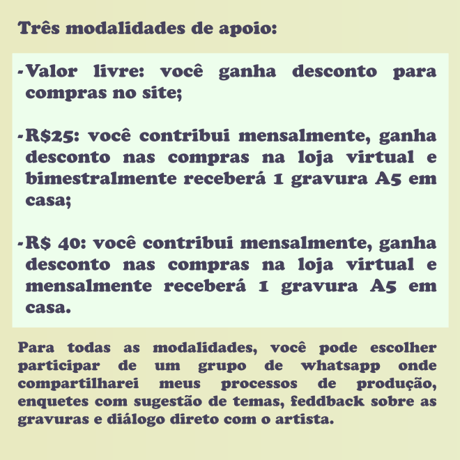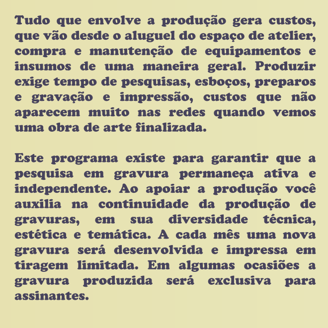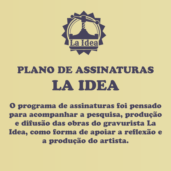 O programa de assinaturas foi pensado para acompanhar a pesquisa, produção e difusão das obras do gravurista La Idea, como forma de apoiar a reflexão e a produção do artista. La Idea é um projeto de impressão experimental e ativismo que teve seu começo no ano de 2008 através do stencil e da serigrafia e, desde então, desenvolveu outras técnicas, linguagens e suportes para tornar real o que existia apenas no plano das ideias. Desde a produção de ilustrações, cartazes e gravuras, passando pela intervenção urbana, até peças de vestuário e obras literárias, La Idea é como um pólo de experimentação gráfica autoral e realização de projetos de impressão para outras pessoas que criam nas artes visuais e na literatura. Tudo que envolve a produção gera custos, que vão desde o aluguel do espaço de atelier, compra e manutenção de equipamentos e insumos de uma maneira geral. Produzir exige tempo de pesquisas, esboços, preparos e gravação e impressão, custos que não aparecem muito nas redes quando vemos uma obra de arte finalizada. Este programa existe para garantir que a pesquisa em gravura permaneça ativa e independente. Ao apoiar a produção você auxilia na continuidade da produção de gravuras, em sua diversidade técnica, estética e temática. A cada mês uma nova gravura será desenvolvida e impressa em tiragem limitada. Em algumas ocasiões a gravura produzida será exclusiva para assinantes. Para os apoios de R$25 e R$40, você receberá em casa as gravuras participantes do projeto, além de ganhar descontos para outras compras na loja virtual. Para o apoio livre, apenas o desconto será concedido. Quem apoiar também terá acesso ao processo de produção através de um grupo de whatsapp exclusivo para membros, onde haverão enquetes com a sugestão de temas, feedbacks sobre as gravuras, perguntas diretas para o artista e dúvidas gerais sobre o plano de assinaturas. Ao concluir sua assinatura (disponível nos links abaixo) o pagamento do plano se dará de forma automática todo primeiro dia de cada mês, sendo que apenas no primeiro mês o pagamento será na data de associação ao plano. O número de assinaturas ativas será essencial para a definição da quantidade de impressões a serem feitas naquele mês. Assinantes também poderão participar de forma ativa conhecendo bastidores e acompanhando o processo, do esboço à arte final.