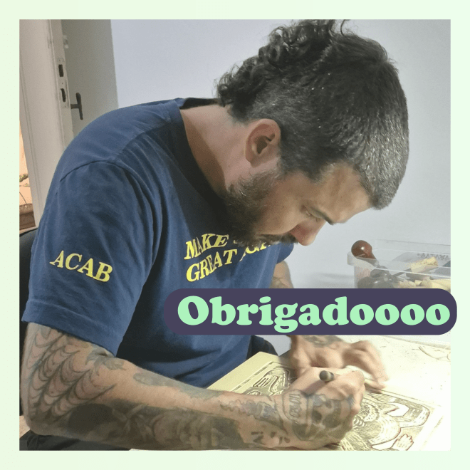 Olá personas, espero que se encontrem bem. Passando para avisar que nos dias 8 e 9 de novembro estarei na Biblioteca Mário de Andrade em São Paulo participando da Feira Miolos. Uma vez mais em 2025 terei a oportunidade de compartilhar espaços de feiras em São Paulo com grandes artistas das impressões e publicações autorais e independentes, além de ver grandes amizades e poder mostrar um pouco mais do que faço, conhecer mais pessoas e tals, ampliando esta grande rede de gente que trampa com papel. Nesta oportunidade, também fui convidado para participar do Papo Tatuí, gravando o episódio do podcast ao vivo no sábado às 17h. Estou bem ansioso com isto tudo. Nos vemos em breve. Até.