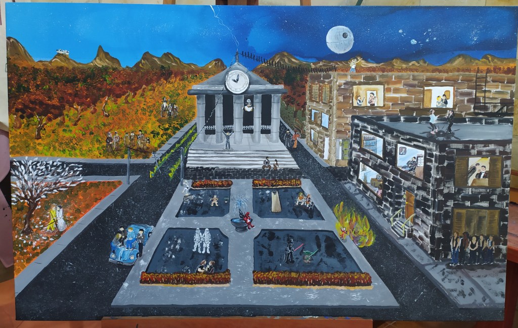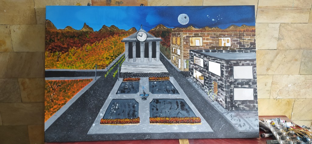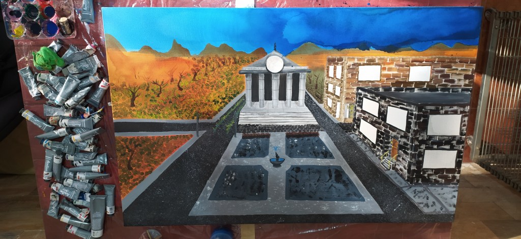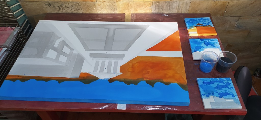 Ainda no esboço virtual, eu tinha feito um teste de cores para compreender uma boa combinação, algo que fosse agradável ao olhar, que chamasse atenção. No final, optei pela combinação de vermelho e de laranja. Cores quentes, ousadas, que não competem por espaço nos nossos olhares. Cores que focavam tudo o que nos é permitido enxergar.
