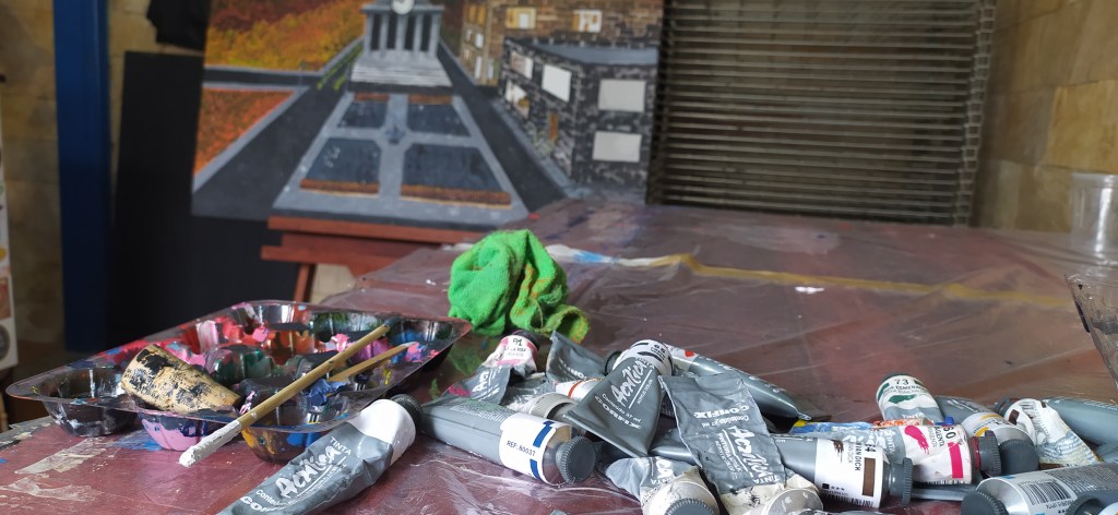 Foram utilizadas tintas a base de água, misturadas com medium extensor (para que a tinta pudesse ser esticada) e medium retardador (para aumentar o tempo de secagem) e assim poder imprimir com menos preocupações.