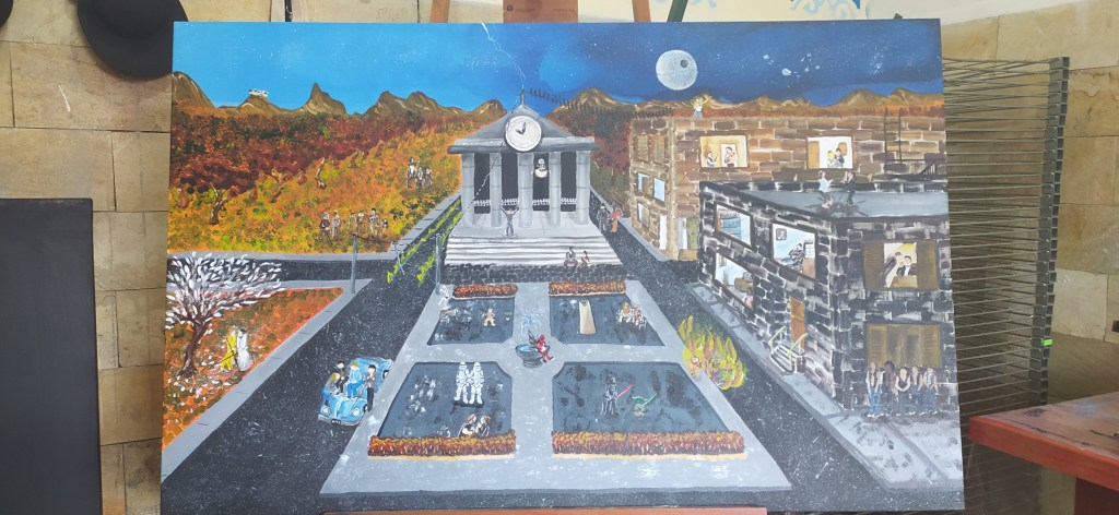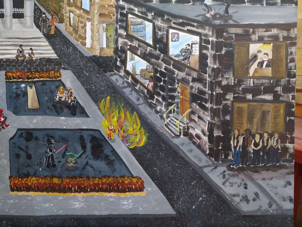 A partir daqui, a matriz passou por mais algumas incisões, corrigindo algumas questões de profundidade, e passou por cortes para separar o primeiro plano do fundo. Como a impressão iria receber duas cores, dividir a matriz facilitou muito o processo de impressão, imprimindo as duas cores de uma vez. Também foi medido o espaço de respiro que teria o papel, e uma borda do tamanho adequado foi mantida.