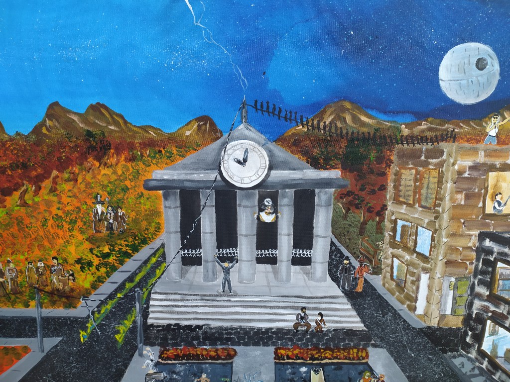 O ponto de partida para planejar esta gravura partiu do trecho transcrito acima: “Desafiava a ordem social vigente…”. Porque ler um livro na rua configurava uma prática de ousadia? Foi a partir desta pequena reflexão que comecei a fazer os esboços. Pensei em um formato de paisagem, com a Carolina ao centro, sentada numa escadinha junto com uma pilha de livros. A frase, adaptada pra gravura, ficaria no céu, como se fosse um fundo, algo que está latente no ar. De um lado a vida: casas, comunidades, morros, roupas, árvores, trabalho, ócio e espontaneidade. Passagens onde circulam rebeldias e ousadias. Do outro, uma barreira de espadas de São Jorge protegem a escritora da pequena viatura que vem para buscá-la. Lugar rígido, duro, acrítico. A ambiguidade dos espaços conflui na figura central, gigante. Sim, ela é muito maior que o braço armado da lei.