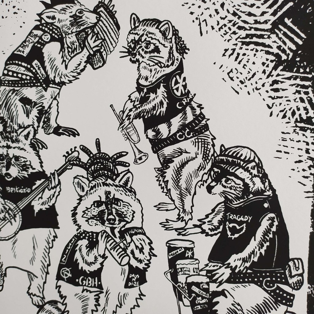 O material escolhido para fazer a gravação foi a matriz emborrachada conhecida aqui como Microduro, que simula algo como o linóleo mas que é mais barato e acessível. O esboço foi feito digitalmente, espelhado, impresso em impressora de toner, e o decalque na matriz foi feito com thinner. Alguns reforços com marcadores permanentes foram necessários para trazer alguns detalhes a tona. A gravação com as goivas começaram logo.