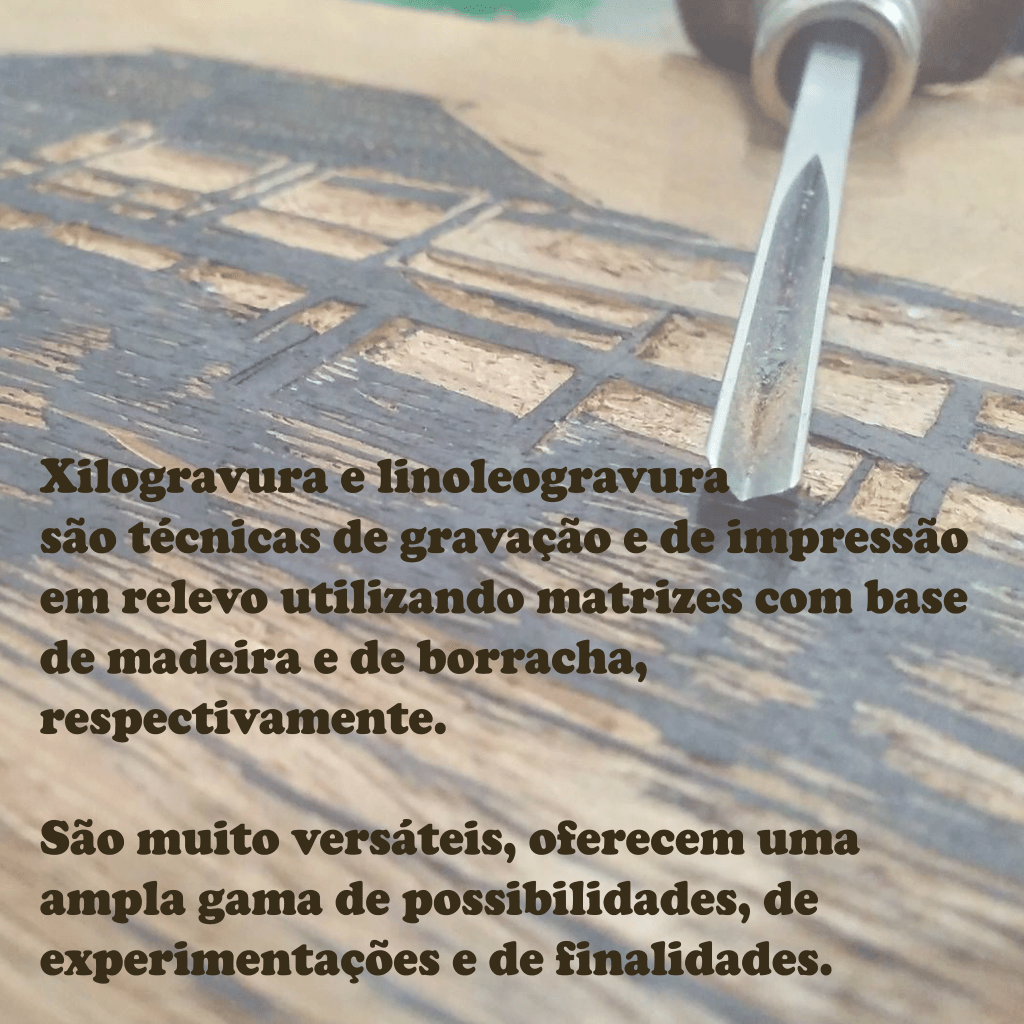 Xilogravura e linoleogravura são técnicas de gravação e de impressão em relevo utilizando matrizes com base de madeira e de borracha, respectivamente. São muito versáteis, oferecem uma ampla gama de possibilidades, de experimentações e de finalidades.