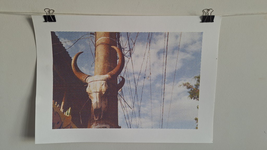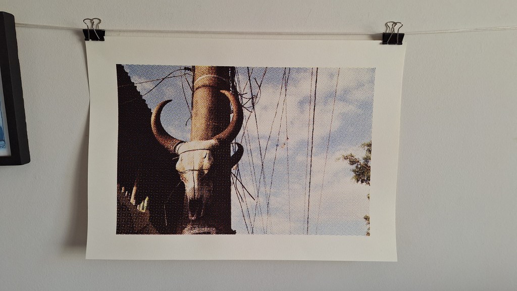 Eu não posso falar pelas outras pessoas que participaram do processo decisório, mas irei soltar algumas palavras sobre o porque eu votei nesta foto. Eu olho para a imagem e vejo uma cena de interior, comum, e que, de alguma forma, é universal. Um crânio de boi no poste, de olho em tudo que acontece. Espanta o que deve ser espantado, atrai o que deve ser atraído, inclusive nossos olhares. O crânio ocupa metade do quadro, e a outra metade o céu divide espaço com fiações do poste. Tudo está interligado. Cena pacata e cativante, bruta e serena, ofensiva e relaxada…