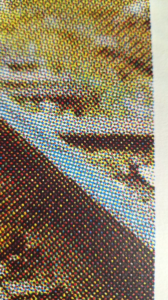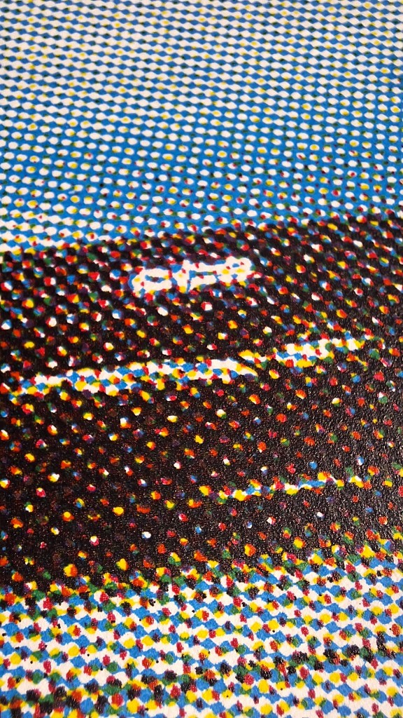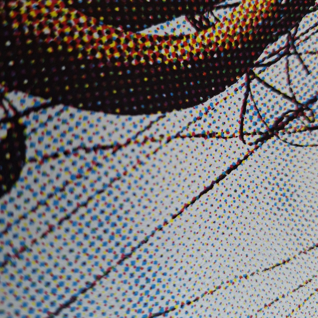 Impresso com tintas Gênesis Hidrocryl Cromia em papel Canson 200g (branco e creme) Tamanho A3 – 42×29,7 cm – formato paisagem Preparação: 300 pixels/polegada, 15 linhas/polegada, formato diamante Tela: Poliéster amarelo, 90/77 fios, chassi de alumínio Rodo: Cabo de madeira, borracha amarela