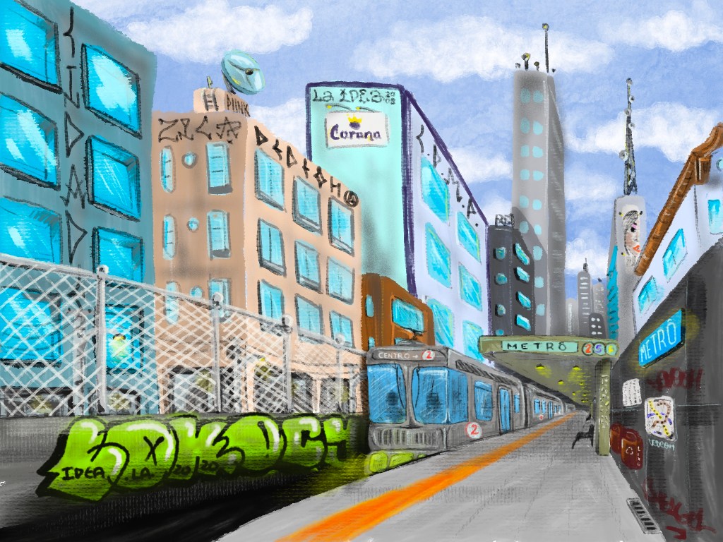 Foi bem massa esse processo mais longo de um meio digital, tentei fazer detalhes bem minuciosos, trazer elementos das cidades grandes, graffitis, pixações, stickers, edifícios, propagandas, antenas, etc. O processo de desenho e pintura foi bem longo mesmo, e logo após o esboço, eu comecei a aula de desenho, para algumas explicações sobre o processo. O time-lapse do vídeo pode ser visto no link abaixo.