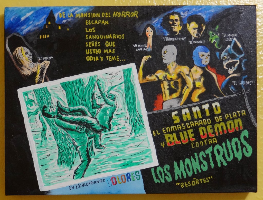 Esta última pintura que analisarei talvez tenha sido a que menos curti o resultado. Nesta, a ideia do tempo passando enquanto o sujeito espera algo fica bem evidente. O sujeito está tranquilo apesar do sol direto de meio de tarde. Um período de relaxamento e contemplação do ato de esperar algo (um ônibus, uma companhia?). Uma das questões aqui foi tentar trabalhar a sombra bem marcada em níveis diferentes de paredes. O que me incomodou foi o alto contraste do toldo e da vidraça da porta que está a direita. Sem querer eu errei a mão na diluição e acabou ficando muito marcado, fugindo um pouco da estética que eu usei no restante da pintura. O céu foi feito também com tinta muito molhada e sal grosso, e o rejunte dos tijolos foi feito com máscara vencida.
