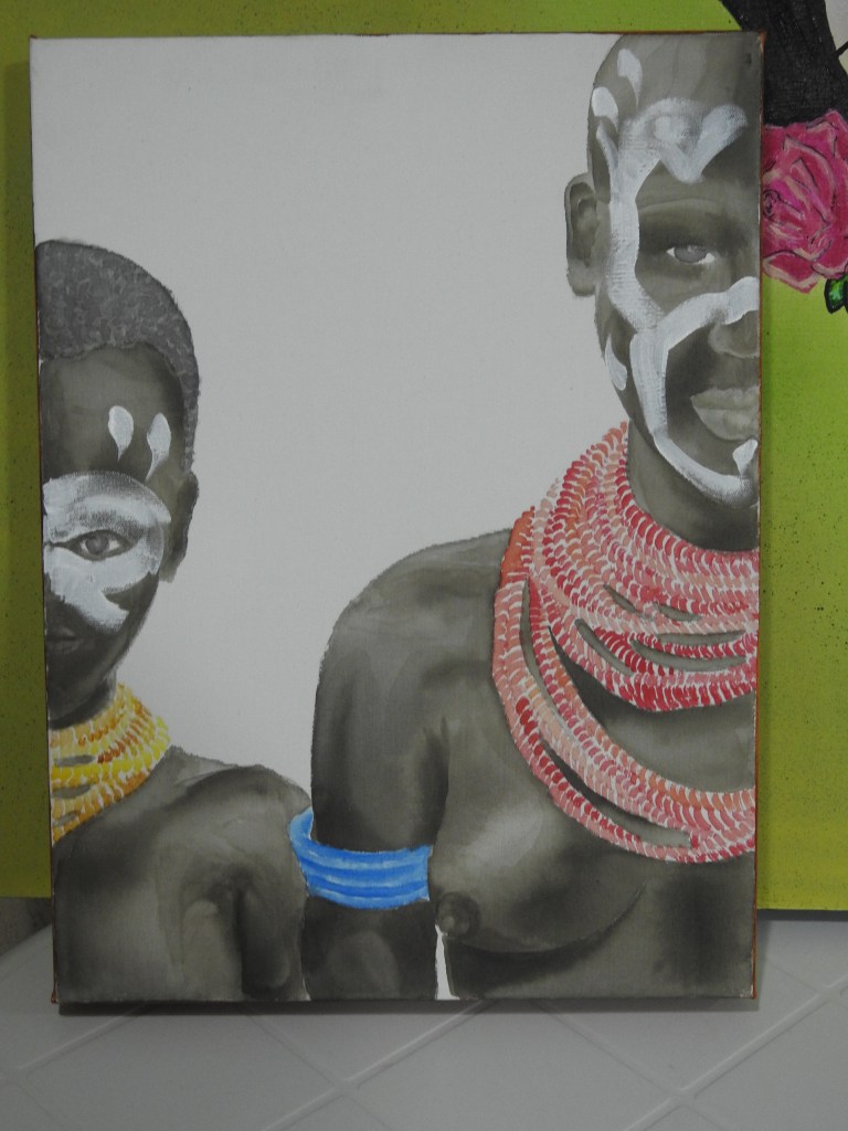 A parede foi feita com tinta em papel molhado e o chão foi feito com manchas transparentes sobrepostas. Os elementos mais definidos foram feitos com camadas sobrepostas para dar forma, luz e sombra.